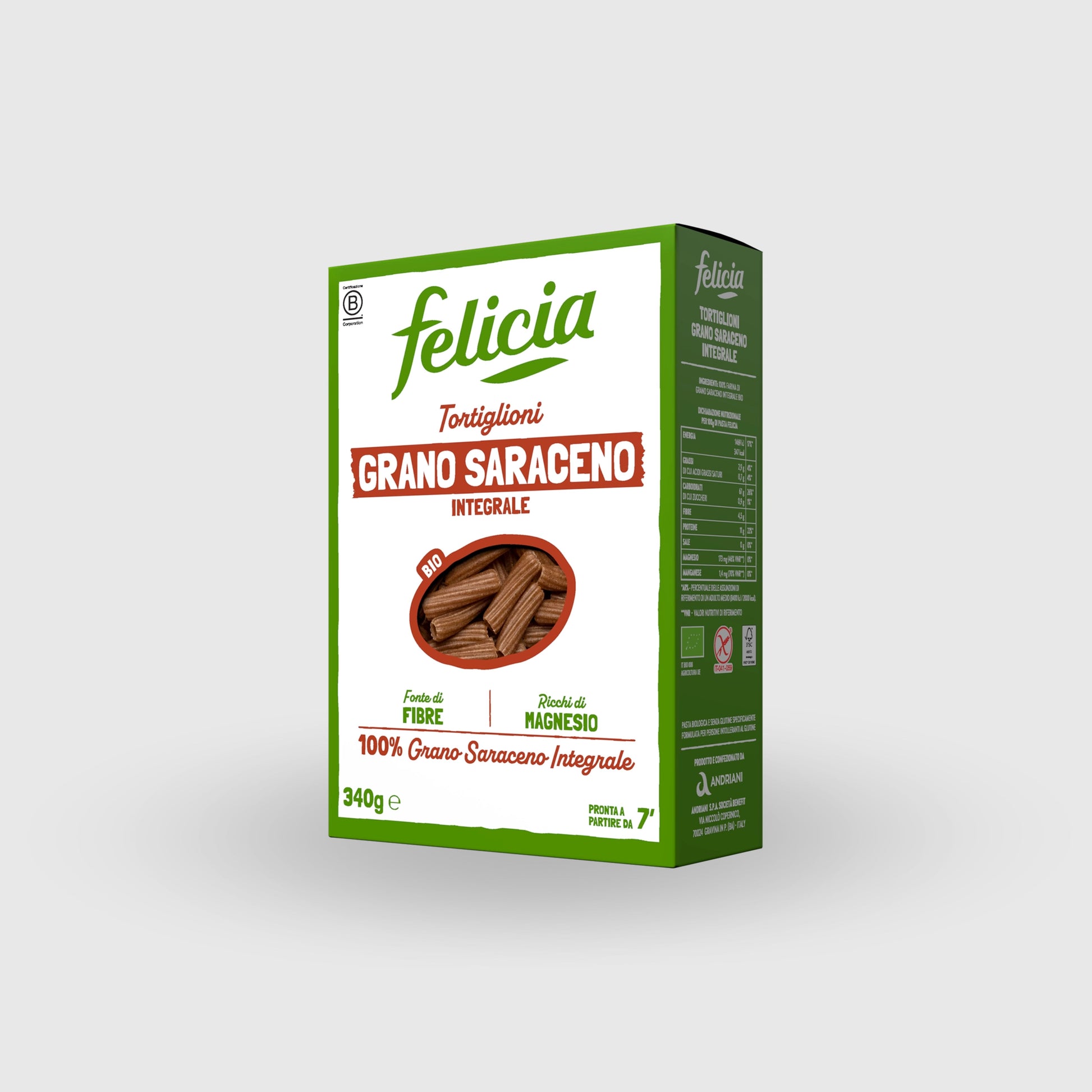 La pasta di grano saraceno integrale Felicia è fonte di fibre ed ha 1 solo ingrediente: 100% farina di grano saraceno bio, naturalmente senza glutine. Il grano saraceno, come tutti i cereali integrali, è alla base della piramide della dieta mediterranea che, accanto a frutta e verdura, raccomanda il consumo giornaliero di 2 porzioni di cereali integrali (di 80g ciascuna). La pasta è ricca di magnesio che contribuisce alla normale funzione del metabolismo energetico, muscolare e psicologica.* *I benefici si riferiscono all’assunzione di 100 g di prodotto.