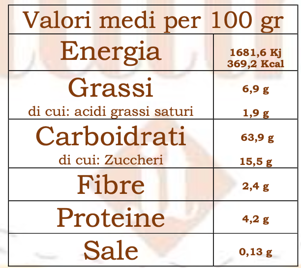 Ingredienti: Amido di mais, farina di riso; destrosio (da mais); Zucchero Semolato; fecola di patate; fibre vegetali (psyllium, bambù); addensanti: (gomma di xantano, idrossipropilmetilcellulosa ed inulina); Uova Fresche; Strutto raffinato; Sale; cioccolato fondente (zucchero, cacao amaro in polvere, emulsionante: (lecitina di soia E322), aroma vanillina); Limoncello.